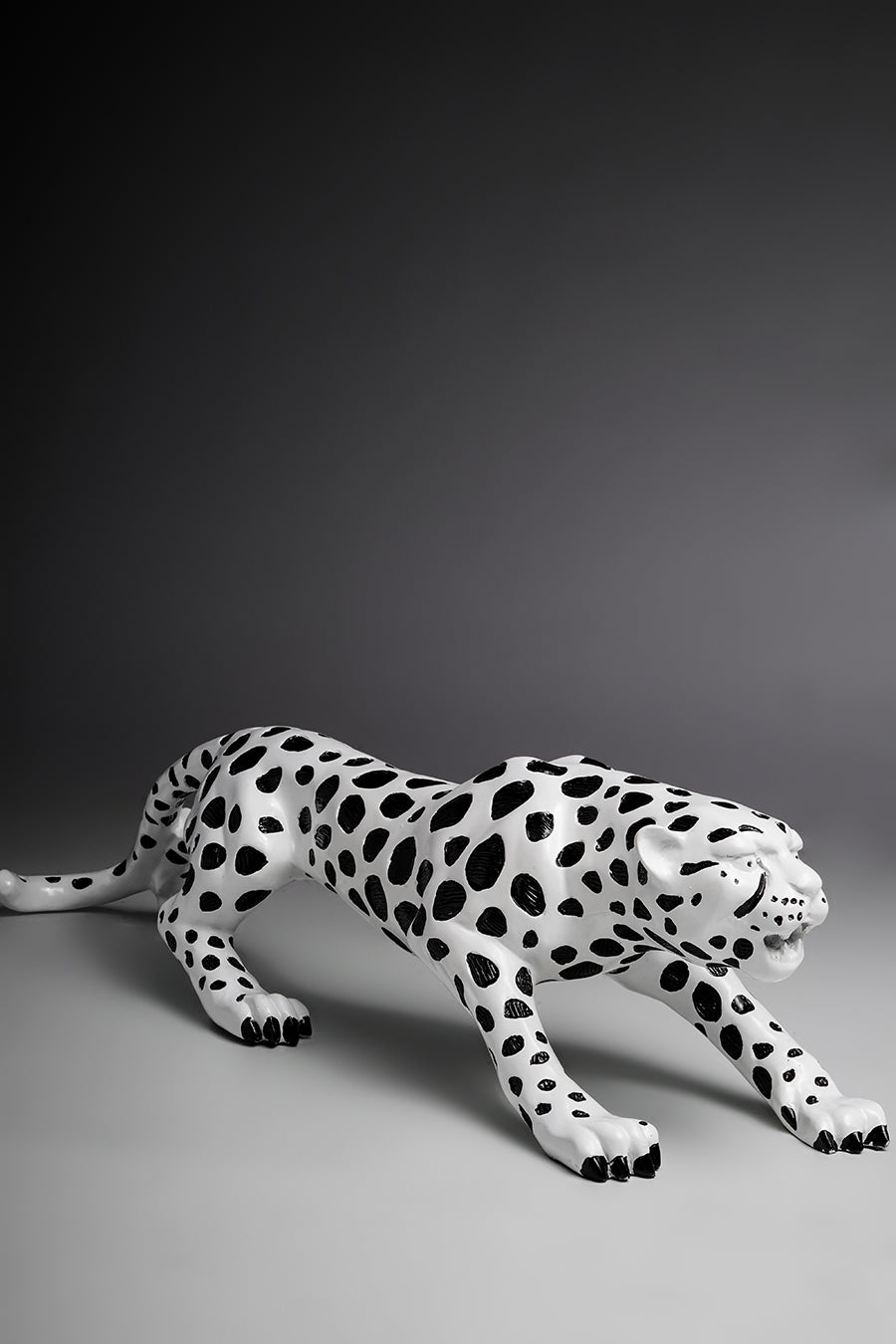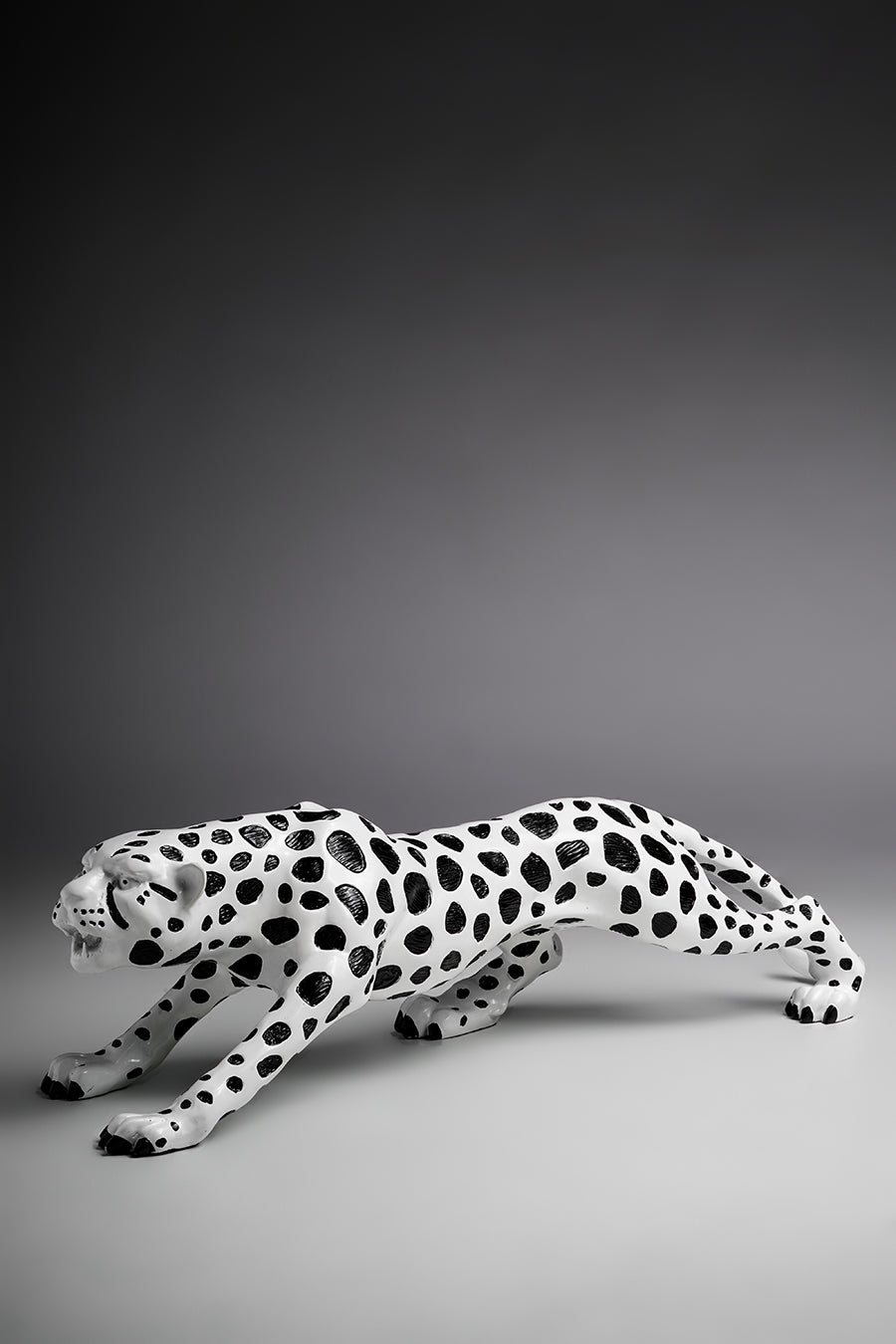 Our Wild Time portrays a leopard figurine in a powerful yet graceful posture. Crafted in the flexuous nature of resin. The materiality of resin makes the intricate detailing of the paws, facial features and tail quite life-like. Introduce the playfulness of this black and white home decor in your kid’s playroom or wrap it up for a loved one.